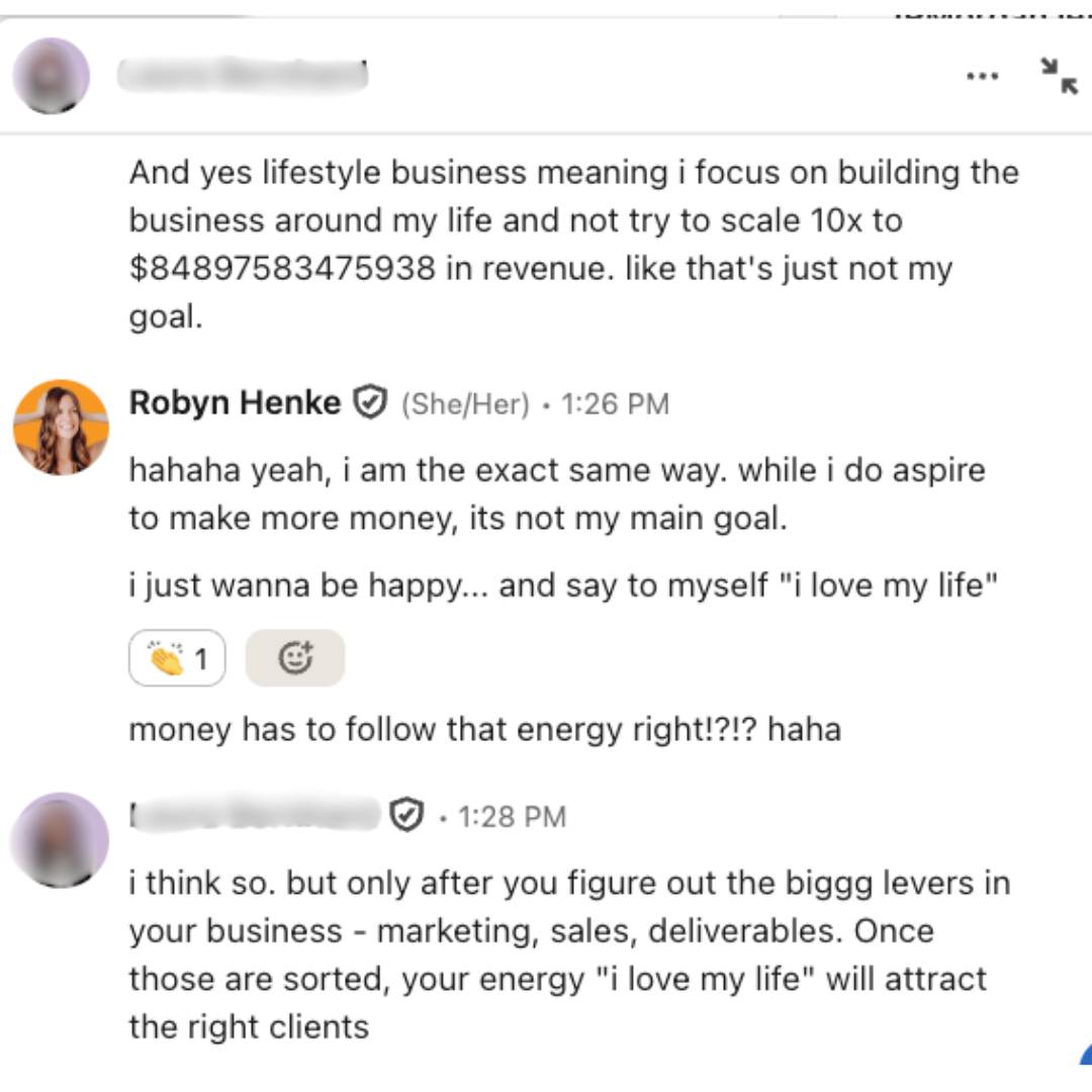 Reminder: client goals... they aren't your ownI had a convo recently with another freelancer that was so validating. We were bonding over the fact that our priority isn't to make $239873534 dollars. We both put lifestyle as the top priority. That loving what we do and how we spend our days matters more than maxing out revenue. "I just wanna be happy," I said. "And say to myself 'I love my life.' Money has to follow that energy, right??" To which she said: "I think so. But only after you figure out the biggg levers in your business – marketing, sales, deliverables" I couldn't believe it. She was articulating the exact thing I had recently tapped into myself and added to my Focus Framework. I call it "Initiative"A custom field for my focus view to categorize each project by its high-level objective. Selling. Basically exactly what she was saying. I kinda think about it like the separate bank accounts I created to keep track of our finances more effectively. Trip savings. Literal game-changer. So... it's basically the same thing in ClickUp.Now when I create the plan, and decide where my focus is going, I'm also thinking about it through the lens of balance. Am I spending all my time on client deliverables? Cool, but what about selling the things I created? If there's resistance to selling the things I created, can I improve them? Is now the right time to create something new? I dropped this suggestion into the Focus Framework channel of the Reset Room, and asked if anyone could see a use case for it in their own business: "There is! I might use this to indicate conservation work and client work. It would be handy to keep me from drifting too much into the conservation stuff." Another alum thought to use it for splitting between internal work and client work, which is especially important when you're actively trying to prioritize your own stuff... like setting up ClickUp. 🤓 She can literally see if she's protecting that time or letting client work eat everything. TBH: I think this might be the real secret to growth.You don't grow by staying in the weeds, or being heads down, just getting things done day after day. That shit right there is a trap. You gotta zoom out. See the bigger picture. And actually execute on the things that move your business forward... not just the things that pay the bills. The goal isn't to eliminate client work. It's to stop it from being the only thing. Keep dreaming + start doing, Robyn Robyn Henke Did someone forward this to you? Subscribe here.